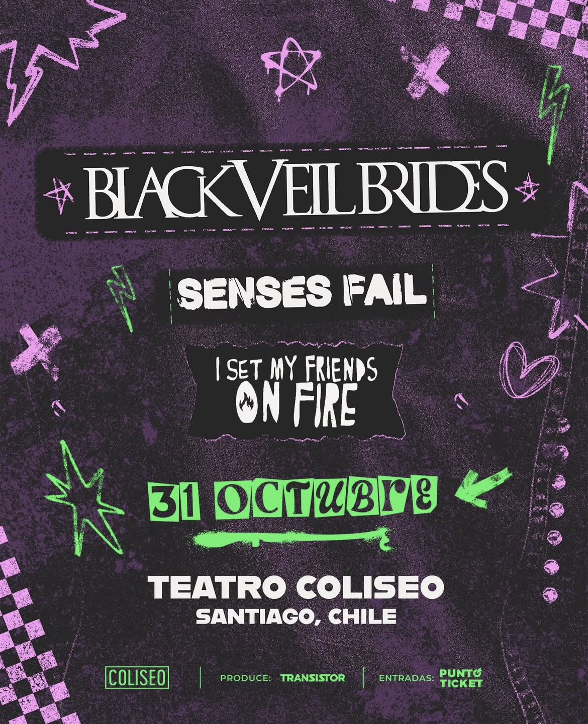 La banda estadounidense Black Veil Brides confirmó su esperado regreso a Chile para este 31 de octubre en el Teatro Coliseo de Santiago, encabezando un cartel que ahora contará con Senses Fail e I Set My Friends on Fire, luego de la baja de Underoath y Silverstein, quienes originalmente formaban parte del evento.
