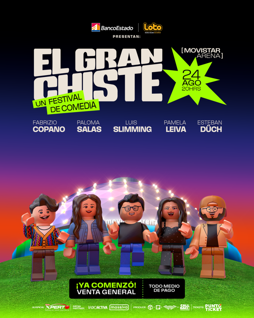 La espera terminó: desde hoy ya está disponible la venta de entradas para todo público del festival de humor más esperado del año. El Gran Chiste llega para remecer el Movistar Arena este 24 de agosto a las 20:00 horas, y las entradas ya se pueden adquirir a través de Punto Ticket con todo medio de pago.