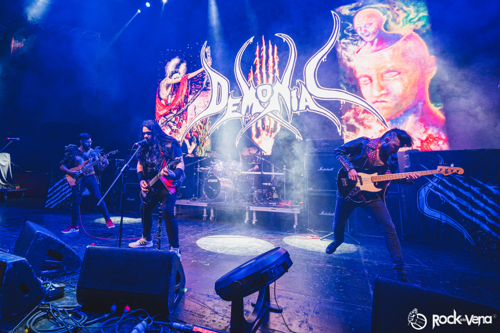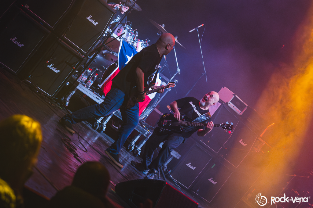 Los primeros en tomar el escenario fueron los chilenos de Demoniac. Con su furia bien afinada, abrieron la jornada como un puñetazo directo al pecho colectivo: “Death comes” y “El lado oscuro de la rosa” retumbaron con crudeza, detonando un mosh inmediato. Cuando arrancaron “Equilibrio fatal”, quedó claro que no estaban allí por nostalgia: su metal tenía urgencia, rabia, ambición. Con guitarras que se cruzaban como espadas, batería que marcaba latidos de guerra, bajo que retumbaba en el estómago, y un frontman que encendía al público con un solo gesto, Demoniac demostró que el presente del metal chileno no está dando saltos pequeños: va de frente, con intensidad, convicción y nuevas texturas. El cierre con “Obra Cósmica” ofreció la confirmación de su crecimiento: la banda provincial —de Limache— confirmó que, pese a la distancia, tiene voz fuerte y presente internacional. Esa apertura fue un arranque perfecto, una declaración de intenciones: esta noche no habría gestos vacíos, sino compromiso en cada riff.