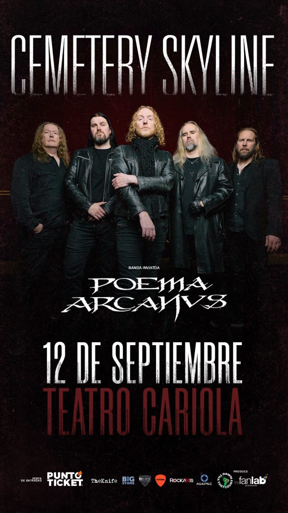 Con el objetivo de dar forma a un proyecto musical sin precedentes inspirado en los grandes referentes del género, nació Cemetery Skyline, súpergrupo que lanzó su primera placa en 2024. Como parte de su Latin American Tour 2025, los célebres músicos debutarán en Chile, el próximo 12 de septiembre, a las 21:00 horas, en el Teatro Cariola. En la apertura del show, se presentará Poema Arcanus, invitado especial en esta cita con el metal de todos los tiempos. Entradas disponibles a partir del día miércoles 28 de mayo a las 11:00 hrs. en PuntoTicket.