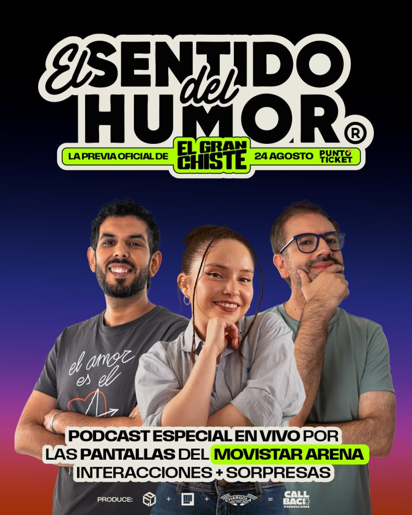 Y, tal como se había anticipado, El Gran Chiste traerá muchas sorpresas. Una de  ellas será la transmisión en vivo de la previa oficial del festival, a cargo del podcast El Sentido del Humor. Desde una hora antes de la apertura de puertas y hasta el inicio del show principal, los comediantes Cynthia GallardoMarcelo Valverde y Héctor Romero, encenderán el ambiente desde las inmediaciones del Movistar Arena, recibiendo a los asistentes y conversando con invitados sorpresa.