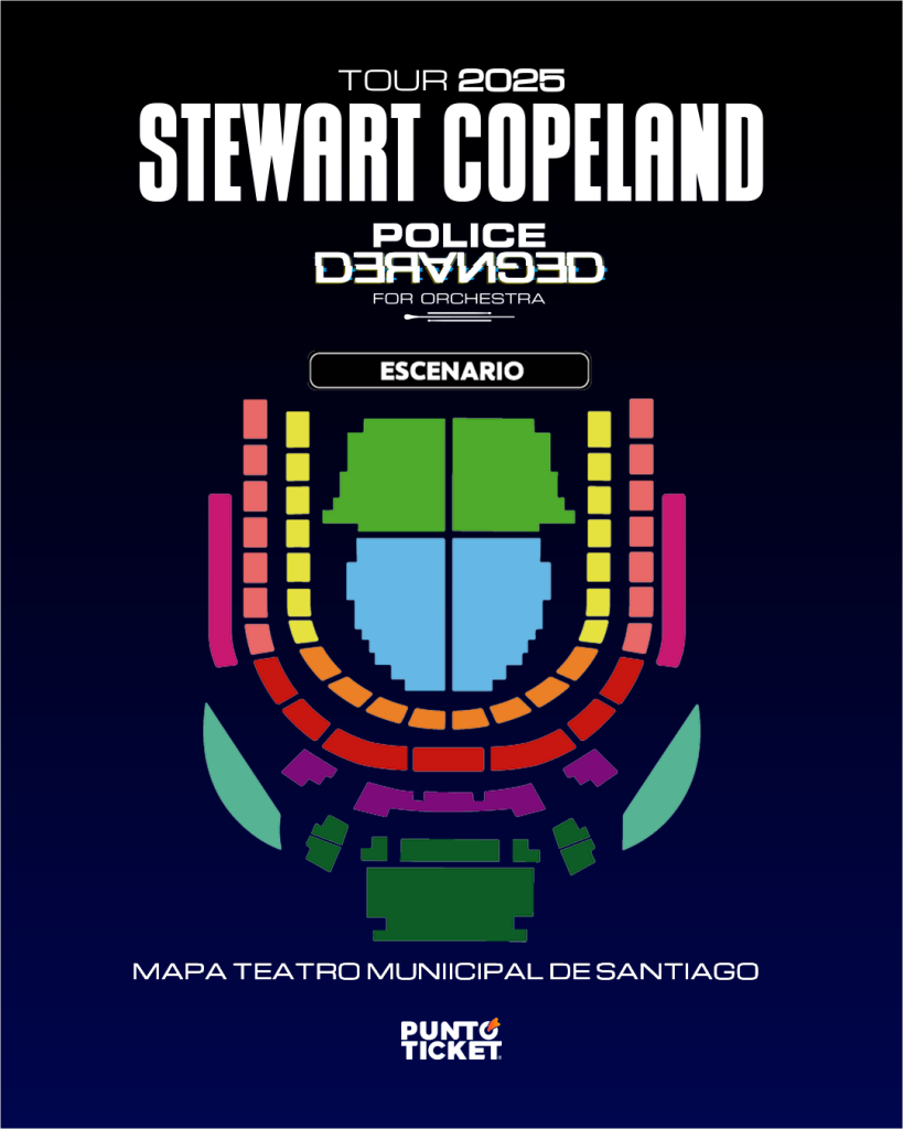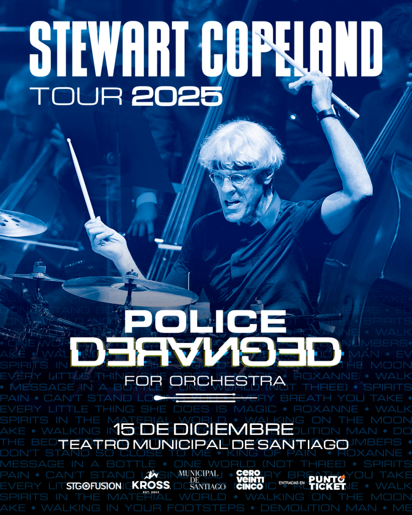 El legendario músico norteamericano Stewart Copeland confirmó su visita a Chile como parte de su recientemente anunciada gira por Sudamérica, fijando su paso por la capital para el 15 de diciembre en el Teatro Municipal de Santiago.