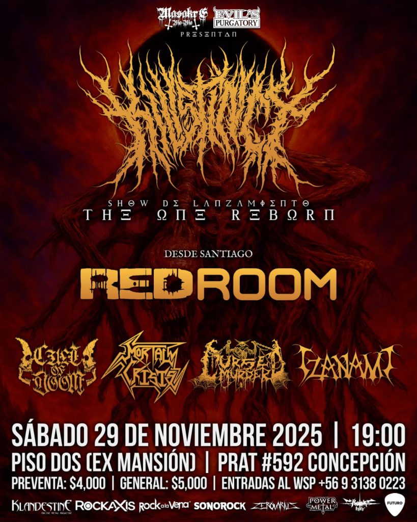 Además, desde Santiago todo el sonido fresco e innovador de REDROOM, que se presentarán por primera vez en Concepción, creada en el 2018 por Felipe Morales en la Guitarra oriundo de Concepción y Raen Kelly en la Voz, sus influencias se basan en el recorrido sonoro de los diferentes músicos de la escena del Metal/Rock que han contribuido con REDROOM en la presentación de diversos escenarios santiaguinos, así recibiendo un gran apoyo de la audiencia. Actualmente, REDROOM, se encuentra en etapa de grabaciones de su próxima placa, pero en redes pueden encontrar algunos singles como “Anymore” del año 2019 y “Possessions”., a finales del 2023 grabadas, editadas y masterizadas en REDROOM PRODUCCIONES. Y por si fuera poco, contaremos con la participación de las nuevas huestes del metal extremo como lo son: – CULT OF DOOM (Los Ángeles) – MORTAL CRISIS (Concepción) – CURSED MURDER (Concepción) – IZANAMI (Punta Arenas) Sean todos convocados a esta masacre auditiva Preventa: $4.000 General: $5.000 Preventas solo por Whatsapp al +56931380223 Sábado 29 de noviembre 19:00 horas, Prat #592 Piso Dos (Ex Mansión) Barrio Estación