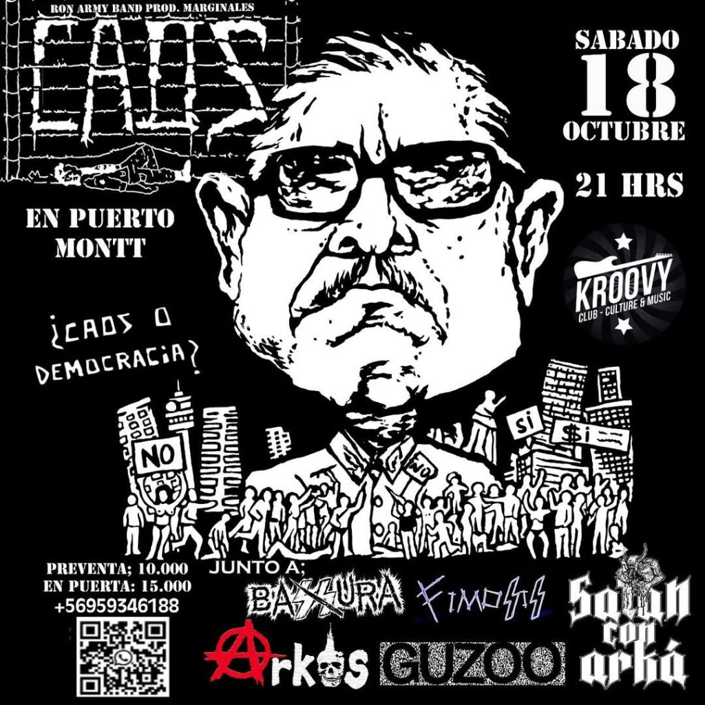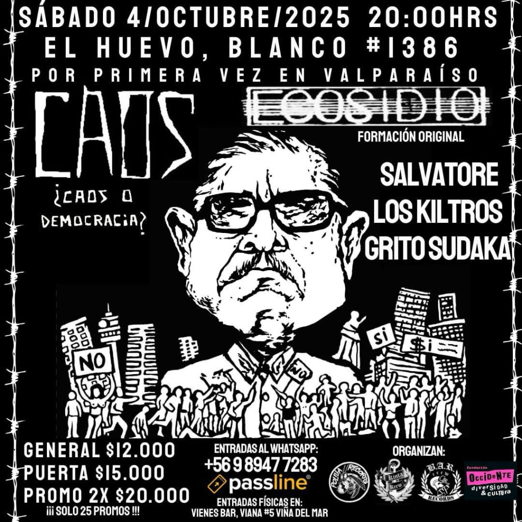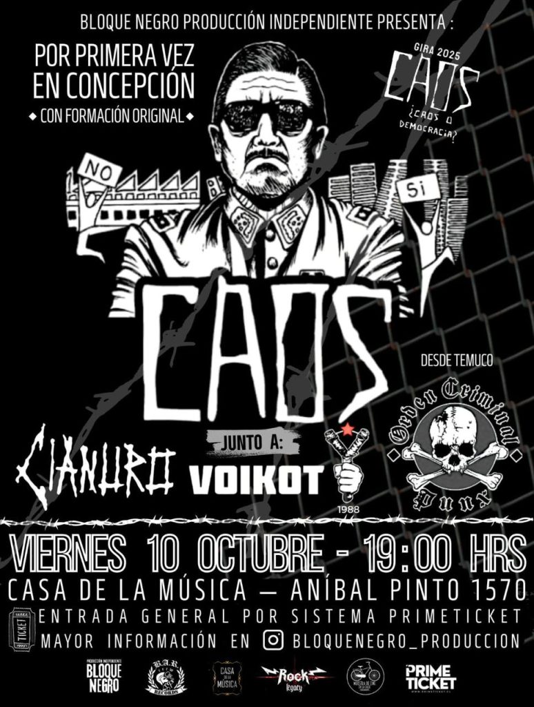 Recordada hasta el día como una de las glorias del primer punk y hardcore acuñado en Chile, y formada entre 1986 y 1987 en Santiago por Lucho Silva, Rodrigo Mota Onetto, Carlos Barrientos y Gerardo Barrenechea, CAOS fue pionera en el movimiento punk chileno y hoy considerada una banda fundamental en la escena. Aunque su trayectoria fue breve, su demo «CAOS O DEMOCRACIA» de 1988 se convirtió en una pieza clave en la historia del underground y del punk en Chile. Grabado en Estudio Rec bajo la supervisión de José Luis Corral, este demo, con letras directas e influenciado por bandas como GBH, Exploited, Dead Kennedys, D.R.I. y Black Flag, expresaba con rabia y urgencia el desencanto de una generación oprimida por la dictadura. La circulación de ese material, de mano en mano, generó gran interés entre seguidores y asistentes habituales del Manuel Plaza, consolidando su potente presencia en vivo y su importancia en la historia musical del país.