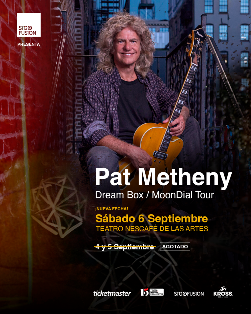 Debido al rotundo éxito de ventas, se suma una tercera fecha para el esperado regreso de Pat Metheny a Chile con su aclamado «MoonDial/Dream Box Tour». A tan sólo días de iniciar su venta, la fecha del 4 y 5 de septiembre se agotaron completamente, lo que motivó sumar una tercera presentación el sábado 6 de septiembre, en el Teatro Nescafé de las Artes. Con más de 20 premios Grammy y una carrera que lo posiciona como uno de los grandes referentes del jazz moderno, el artista vuelve a Chile con su nuevo espectáculo en solitario, parte de la gira “MoonDial/Dream Box Tour” en un formato que promete ser uno de los grandes hitos musicales del año.