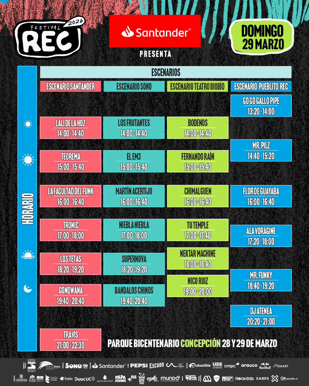 Faltando pocos días para la realización de su undécima edición, el Festival REC 2026 entregó los horarios de las presentaciones de los artistas que serán parte de evento el próximo 28 y 29 de marzo.