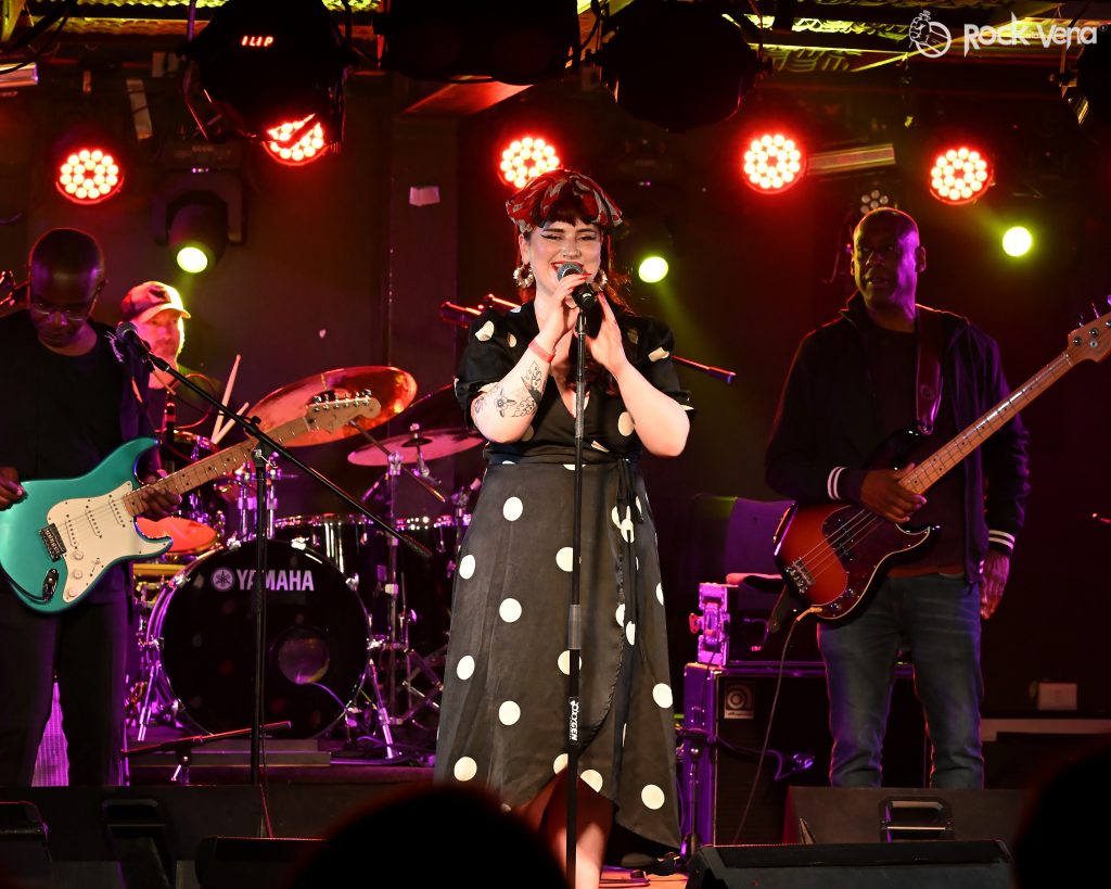 A las nueve en punto, con la sala vibrando en una sintonía de corazones expectantes,The Amy Winehouse Band emergió, y un trueno de ovaciones y aplausos sacudió los cimientos del lugar. En ese instante, los primeros acordes de “Know You Now” tejieron su magia en el aire. Con ellos, Bronte Shande, etérea y deslumbrante en un estilo pin up que era un eco visual de la propia Amy, su peinado y vestido un portal a otra era. Su voz, un hilo de oro y terciopelo, electrizante y suave, nos abrazó. Era innegable: el carisma y el timbre vocal de Shande parecían invocar el aura, la energía misma de Winehouse, como si su espíritu danzara entre las notas.