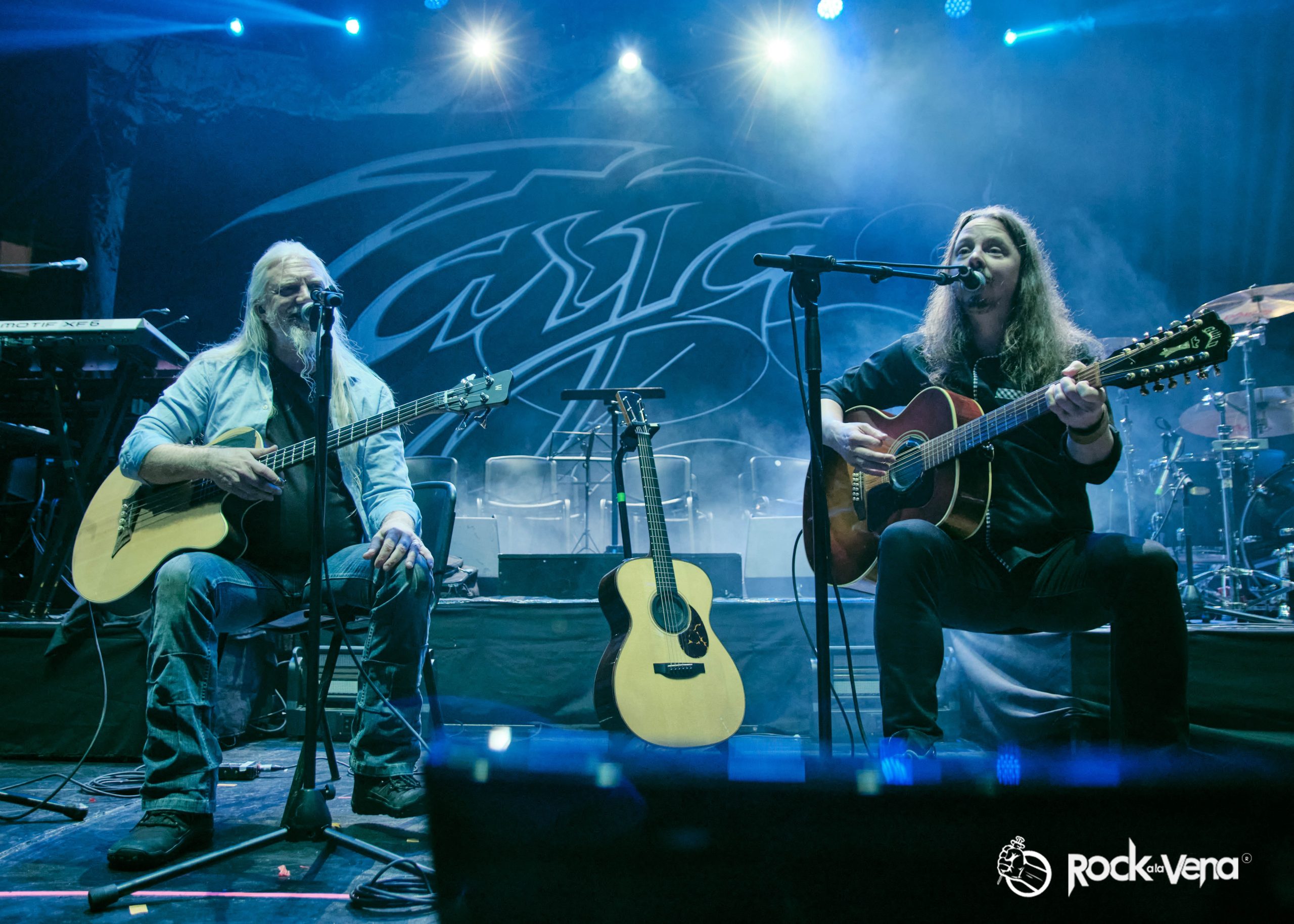 Aproximadamente a las 20:00, vemos a Marko Hietala junto a Toumas Wäinölä salir al escenario para ubicarse en sus puestos y comenzar su set acústico.